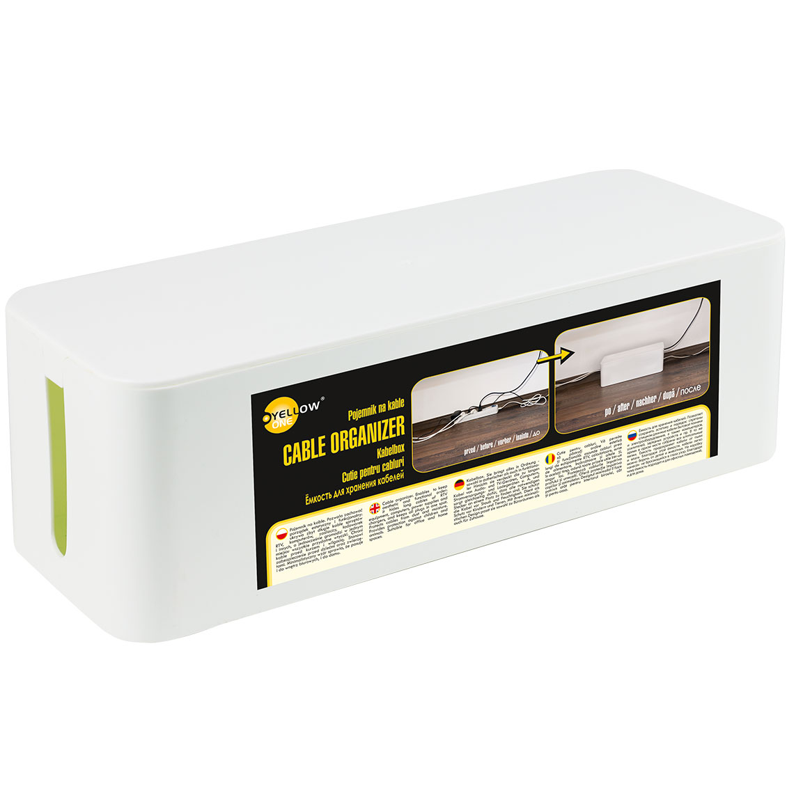 – enables to keep aesthetic and functional order: it hides long cables of RTV equipment, computers, power supplies and chargers, and keeps all plugs in one spot